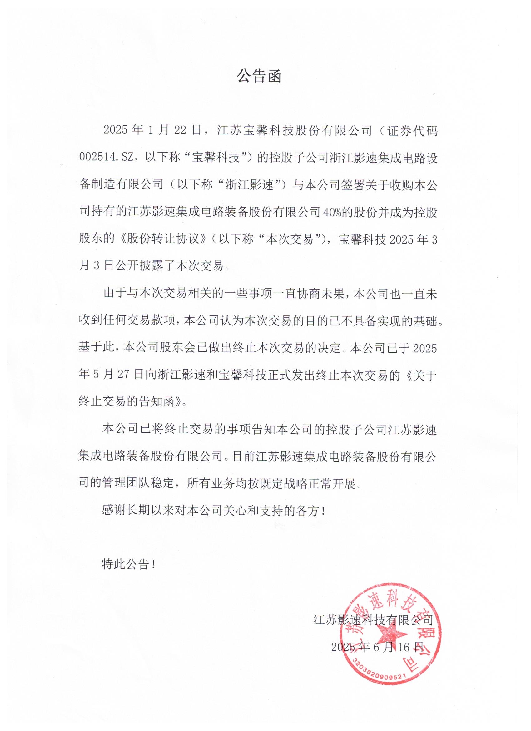 由于與本次交易相關(guān)的一些事項一直協(xié)商未果,江蘇影速科技有限公司也一直未收到任何交易款項,江蘇影速科技有限公司認為本次交易的目的已不具備實現(xiàn)的基礎(chǔ)。基于此,江蘇影速科技有限公司股東會已做出終止本次交易的決定。江蘇影速科技有限公司已于2025年5月27日向浙江影速和寶馨科技正式發(fā)出終止本次交易的《關(guān)于終止交易的告知函》。